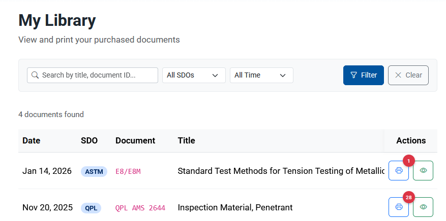 The eyeball lets you view the searchable digital version of your standard through the browser, and printer lets you print. Clicking on the printer will prompt you with an agreement. USE MICROSOFT EDGE